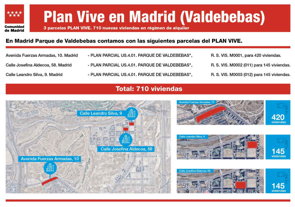 No hay un plan como tal que se llame «Plan VIVE Valdebebas». Pero sí que se van a construir 700 viviendas en esta zona de Hortaleza. Se repartirán en tres manzanas, una de ellas es la de Leandro Silva 9 y tendrá 152 viviendas. Las otras dos son Josefina Aldecoa 58, con 156 viviendas y en la Avenida de las Fuerzas Armadas 10, que tendrá 420 viviendas. Por tanto, en 2023 finalizarán las obras de estos edificios de alquiler barato en Valdebebas.